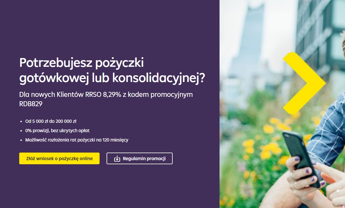 - Promocyjne RRSO 8,29% z kodem RDB829: złóż wniosek o pożyczkę gotówkową lub konsolidacyjną i skorzystaj z niższego RRSO w promocji dla nowych klientów.